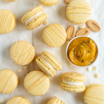 Hi! Coming at you with a wee spring inspired macaron this month! Ever since I discovered that the supermarket near me sells passionfruit pulp in a pouch, it’s been going into everything (I made passionfruit cream puffs today, coming at you soon!). I had some passionfruit curd leftover from testing this passionfruit layer cake a while back, so we repurposed it in these macs.