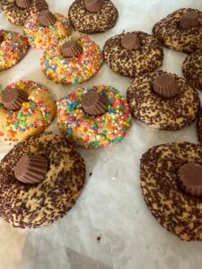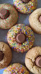 - Sprinkles, raw sugar, etc for rolling: The fun part about these peanut butter blossoms is that you can finish them any way that you want! Roll them in crunchy sugar, sprinkles of your choice, mix and match with whatever you like.