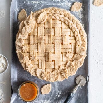 - Arrange the strips of pie dough on the top of the pie, weaving into your desired lattice. If you are adding stamps, trim any overlapping pie dough and lattice strips so that they are flush with the edge of the pie dish, then glue on the stamps with a little egg wash. If you are crimping, trim the crust with a little overhang and then crimp as desired.