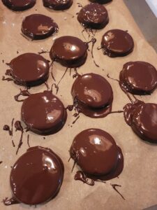 - Place the dipped patties onto the prepared baking tray, then repeat the process with the remaining discs of peppermint dough.
