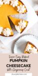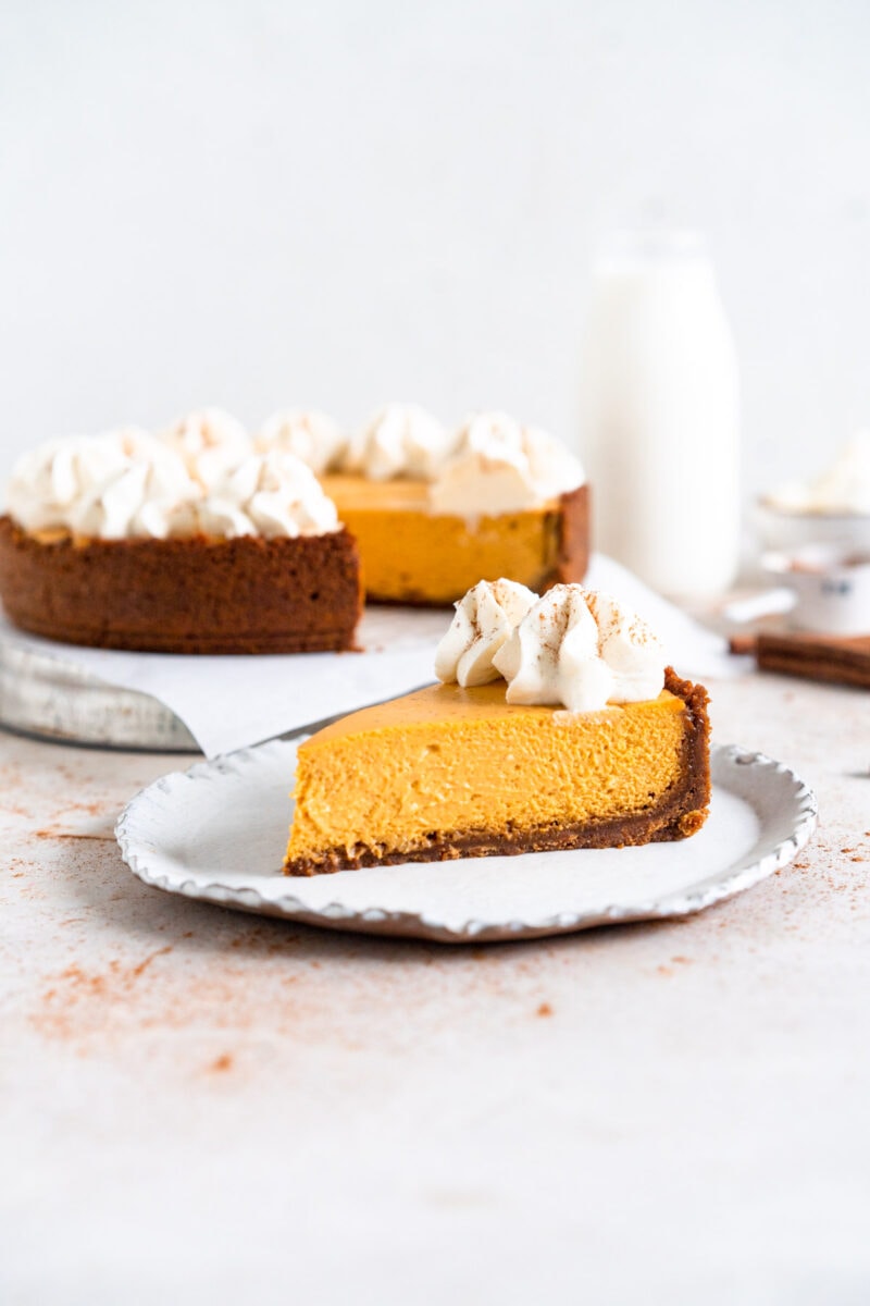This Pumpkin Cheesecake has a smooth and creamy pumpkin filling and a buttery gingersnap crust, and is topped with piped whipped cream. This Cheesecake can easily be made ahead of time, and makes the most perfect dessert.
