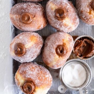 Salted Caramel and Milk Chocolate Ganache filled Brioche Doughnuts - Fluffy brioche doughnuts are rolled in sugar, then filled with a silky salted caramel and milk chocolate ganache. These are the ultimate stuffed doughnut.