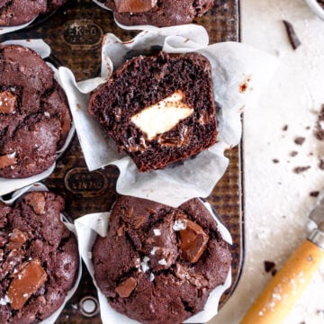 Hi hi! Just popping in to share this recipe with you for Small Batch Chocolate Muffins! These muffins are super easy to make and also come together really fast. They have a double chocolate muffin base, and they are filled with a big chunk of cream cheese. The recipe is small batch and only makes 6 muffins, which, to be honest, is the perfect amount of muffins for most people! Small muffin recipes are quick and easy, and one of my favourites.
