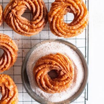 Crullers are circles of piped choux dough, fried until perfectly crisp and golden, then tossed in your choice of sugar or dipped into a glaze. These crullers are rolled in spiced sugar for the perfect holiday or anytime treat.
