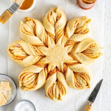 Using a jarred pesto takes some of the work out of this star bread, making it quick and easy to assemble. It bakes up into a tear and share style bread, so is perfect for a party or holiday gathering. You can just plonk the whole thing down on the table and let people go for it!