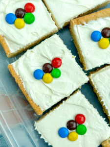 - Chill the cookie bars slightly. Yes, I also chill my cookie bars, just a little bit. This gives the frosting time to set and to also crust over, which gives a nice clean cut. You can also leave it at room temperature uncovered for a little to help it crust, but chilled will give you the cleanest cut here.