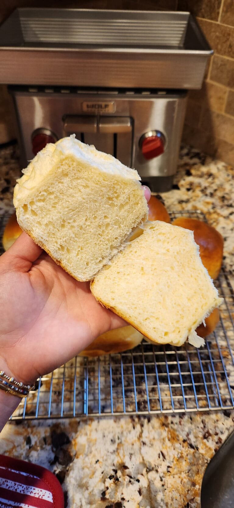 Absolutely incredible! The bread is super soft and pillowy, creating the perfect texture for any recipe. I made it without using a stand mixer(left both my mixers at my moms), and even though the dough was a bit sticky, a little flour on my hands worked wonders. The end result was nothing short of delicious. This recipe is a must-try! I used them for chicken sandwiches. A good workout of slamming and kneading though without a mixer.