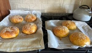 - Leave the buns to rest for 10 minutes, then give them a quick roll to tighten them back up. Place them in the prepared rings or spaced apart on the baking sheets. They rise quite a lot so ensure they are far enough apart - you can do 5 on on pan and 4 on the other. Alternatively you can space them closer so they bake to be touching.