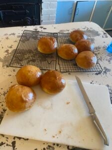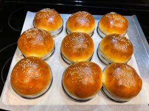 Remember that if you make the burger buns smaller, the rising time for the second proof will be different. I made these and divided them into 12 and the rise time was only about 45 minutes as opposed to 1 ½ hours so just keep an eye on them.