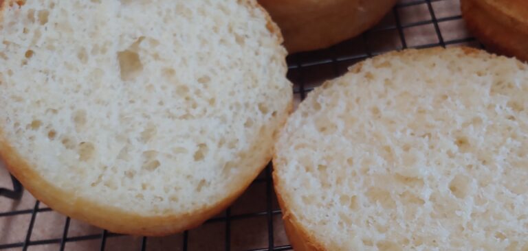 I made these burger buns with these super fun ring molds that my friend Campbell made for me! They are 10cm in diameter and 3cm high, and the perfect size to make burger buns! The ring means that the bun rises super evenly but also gives it a really nice ring around the edge, making it perfect to cut into burger buns.