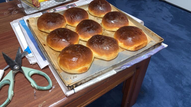 Incredible burger buns! They came out super soft and the sweet milk bread taste is fantastic. Measuring the ingredients by weight makes it so easy, you just put the whole bowl on a scale and add up the grams with each ingredient as you go. I did not take much care to get the buns evenly sized, but they cooked perfectly regardless.