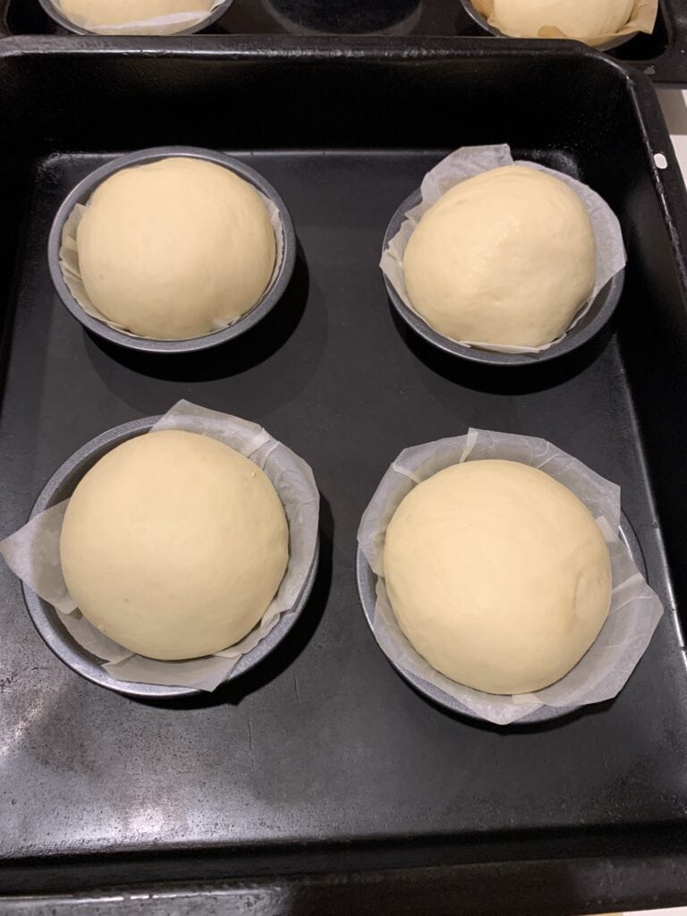 - Turn the dough out onto a lightly floured surface. If you are using rings for your buns (I used 100mm rings for 90g buns), grease them lightly.