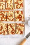 - Make the base. Preheat the oven to 350°f/180°c. Line a 9"x13" (23cm x 33cm) baking pan with parchment paper, leaving some overhang to help with removal of the slice once cool. In the bowl of a stand mixer fitted with the paddle attachment, cream the butter and sugar until thick and pale, approximately 5 minutes.