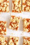 - Add the crumble. Sprinkle the remainder of the base mixture evenly over the caramel - you want it to be in lumps leaving some caramel showing.