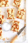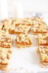 I used a 9"x13" (23cmx33cm) pan to bake this in. It comes out quite thinly but this works well as it means you get a thin caramel layer. If you want it to be thinner I would recommend halving the recipe and doing it in an 8" square pan. Make sure you have a little parchment sticking out from the sides of the slice to help you remove it from the pan. The parchment is important as the caramel can be sticky.