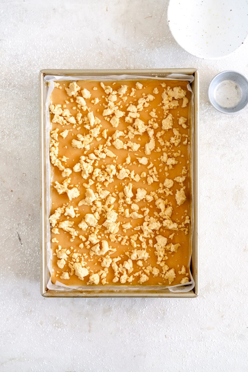 - Crumble Remaining Shortbread - The remainder of the shortbread base is crumbled over the caramel topping, and then spread out evenly.