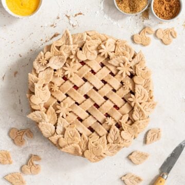 - I cut my lattice strips using a fluted cutter, and then finished the pie using cut-outs from leftover pieces of pie dough which I pressed together and rolled out.