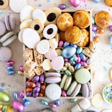 I wanted to make a variety of treats for this box to show how easy and fun they are to put together - I like making a couple of time intensive recipes that can easily be doubled (such as the macarons and hand pies), and then pairing them with some easy to make treats (Cardamom Linzers, Marshmallows, and Brown Butter Crispy Rice Bars), and then rounding it out with some store bought items - this time I chose to use a bunch of Moser Roth and Choceur Easter Eggs from ALDI (which are available Starting the 27th of March). I also like using recipes that can be used in a few applications - for example I made one batch of the Cardamom Linzer dough, and filled some with Jam, and iced others with some Royal icing to provide a variation in designs. Adding in the Easter eggs was the perfect finishing touch - not only are they super delicious, but they are crazy cute and really help with driving the Easter theme home! This treat box would make a great Easter gift, or as something to take along to an event or Easter brunch - either one or two batches of the recipes that I have included here would be great for making 7-8 boxes for family and friends.