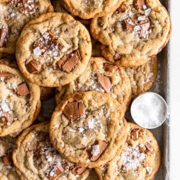 - Bake for 12-13 minutes, or until lightly golden and beginning to set. Baking time depends on personal preference - if you like them a little softer, bake for 12 mins, if you like them a tiny bit crispy then bake for 13. Remove from the oven and sprinkle liberally with flaky sea salt. Allow to cool on the pan - the cookies will deflate slightly as they cool. Repeat the baking process with the remaining cookies.