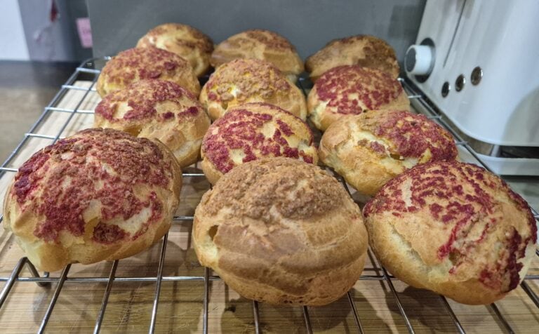 - Day One: Make the pastry cream. Prepare the craquelin and roll out and freeze ready for when you make the choux pastry. Both these components can be prepared up to two days ahead.