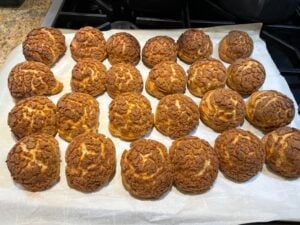 - Remove the craquelin from the freezer, and peel off the top piece of parchment. Using the same sized cutter you used to trace the circles on the parchment paper, cut out circles of dough. Place each carefully on top of a mound of choux, pressing lightly to adhere. If you are baking one tray of these at a time, ensure that you only put the craquelin on one tray worth at a time - put the craquelin on the second tray just before you bake them.
