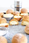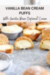 These Vanilla Bean Cream Puffs or Vanilla Bean Choux au Craquelin are the perfect dessert. Crispy cream puffs are topped with a layer of craquelin and filled with a simple Vanilla Bean diplomat cream. This ultimate guide to making cream puffs walks you through all the steps, so that you too can make your very own homemade cream puffs.