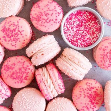 Strawberry macarons, made at home! Yes. you. can. With a bit of practice — and my kitchen-tested tips and tricks — this recipe proves you can make French macarons successfully at home in your own kitchen! This post includes step-by-step instructions for making the delicate vanilla bean French macarons shell, and strawberry buttercream filling too.